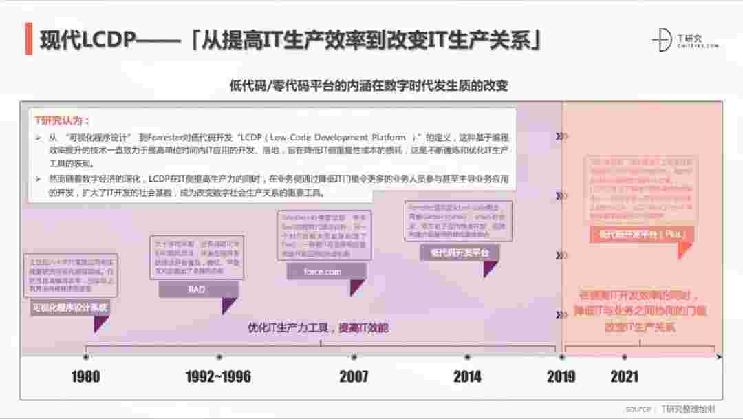 2020年前后,,源于提高IT工作者开发效能的LCDP不断进化和衍生,,面对业务导向日益明显的数字化变革。。。。LCDP衍生出了面向不同对象的升级服务——面向专业人群的LCDP和业务人群的NCDP,,,LCDP与NCDP的不同服务属性被逐渐认可和接受。。。。 LCDP在提高IT开发效率的同时,,,降低IT与业务之间协同的门槛改变IT生产关系。。。
