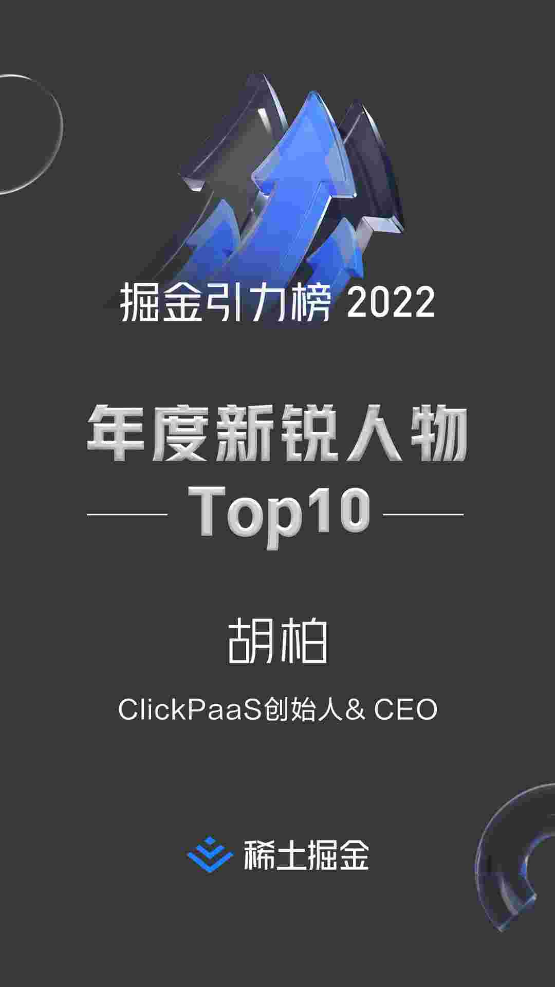 2022年1月6日,,稀土掘金社区第一届「掘金未来大会」成功举办,,,会上发布了“2022 稀土掘金引力榜 年度新锐人物”榜单,,,,上海爱湃斯科技有限公司(简称NO钱包)创始人及CEO胡柏实力入选年度新锐人物TOP 10。。。。